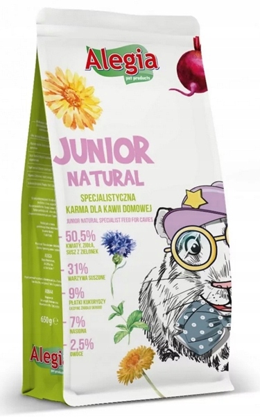 ALEGIA Junior Natural to pełnowartościowa karma dla kawii domowej do 8 miesiąca życia bez ziaren zbóż. Podstawą są susze zielonkowe (50%), zioła lecznicze i kwiaty dostarczające naturalnych witamin i minerałów. Zawiera suszoną lucernę, marchew, pasternak, nagietek, pokrzywę, rumianek i owoce dzikiej róży.
