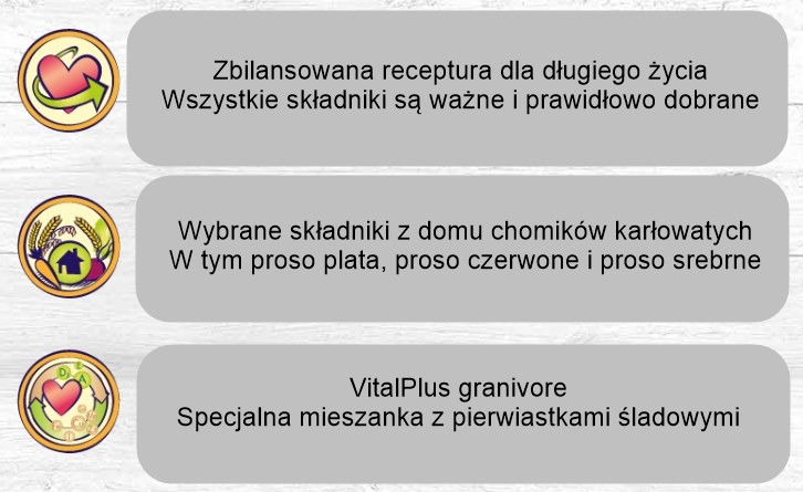 VitalPlus granivore: Specjalna mieszanka z witaminami i mikroelementami zawierająca wysokiej jakości składniki odżywcze: komosę ryżową i fasolę mung