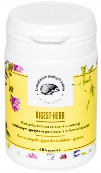 Digest - herb dr Ziętka to ziołowy dodatek paszowy w kapsułkach, polecany królikom i gryzoniom z osłabionym łaknieniem, z brakiem apetytu i atonią jelit.