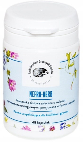 Nefro - herb dr Ziętka to ziołowy dodatek paszowy w kapsułkach, polecany królikom i gryzoniom z infekcjami układu moczowego, z uszkodzonymi nerkami czy w trakcie leczenia kamicy układu moczowego.