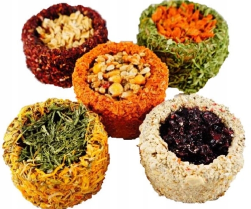 Skład: Pasternak, marchew, pietruszka, nagietek, hibiskus, kukurydza zwyczajna, groch, pszenica, sorgo, kukurydza czerwona, słonecznik, proso, peluszka, owies, dari, kardi, celuloza, skrobia.