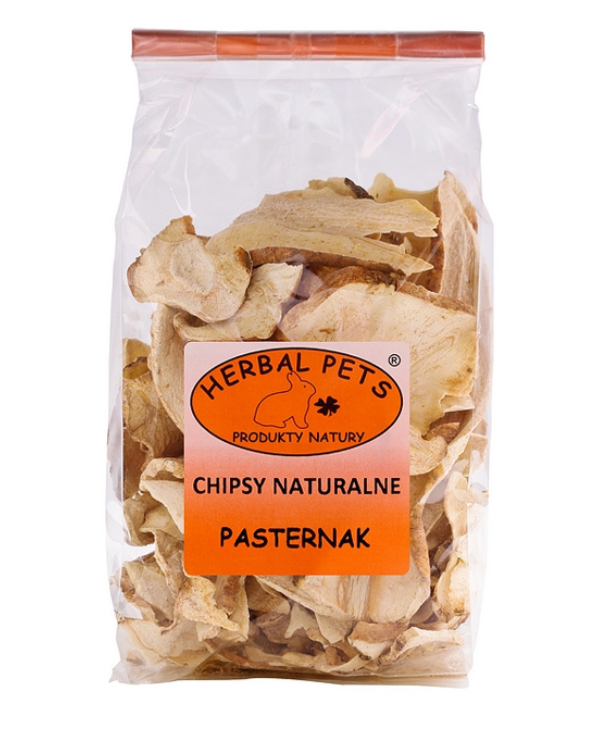 HERBAL PETS Chipsy Naturalne – Pasternak 125g to naturalny, uzupełniający przysmak dla królików, świnek morskich, szynszyli, koszatniczek, chomików, myszek, myszoskoczków i szczurów. Korzeń pasternaka jest bogaty w witaminy oraz cenne minerały, wspomagając codzienną odporność, zdrowie i dobre samopoczucie Twojego pupila.