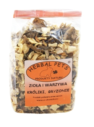 Herbal Pets Zioła i Warzywa to karma uzupełniająca przeznaczona dla królików, koszatniczek, chomików, świnek morskich, szynszyli, myszy, szczurów i myszoskoczków. Mieszanka stanowi roślinny dodatek do diety, który urozmaica codzienne karmienie i dostarcza naturalnych składników wspierających organizm.