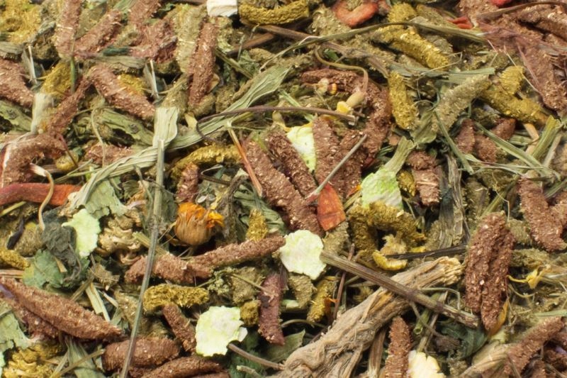 Zioła rosnące na pastwiskach u podnóża Alp, płatki grochu, włókno roślinne, marchew, martwa pokrzywa, babka zwyczajna, burak 2,5%, kwiaty nagietka, nasiona lnu 1,4%, nasiona kopru włoskiego, korzeń pokrzywy, płatki fasoli koni, mięta pieprzowa, natka pietruszki, płatki rumianku, melisa, nasiona konopi 0,75%, kminek, kurkuma, bez czarny, FOS 0,04%, rokitnik zwyczajny, jagody, maliny, bób, majeranek, youcca 0,02% , nasiona anyżu, bazylia, koper włoski, kwiat bzu czarnego, kwiat lawendy, rozmaryn, szałwia, tymianek;