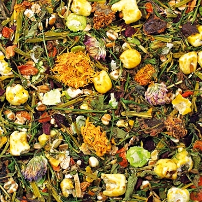 Płatki owsiane, płatki pszenne, płatki grochu, marchew, pietruszka, lucerna, pszenica, pszenica dmuchana, płatki kukurydziane, kukurydza dmuchana, melisa, mięta pieprzowa 3,3%, burak, żebrówka, jeżówka, nagietek 1%, koniczyna czerwona, owies, mniszek lekarski, siano łąkowe
