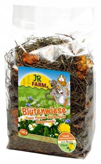 Jr Farm łąka pełna kwiatów to zdrowa, surowa pasza na każdy dzień. Ta pachnąca uczta dla smakoszy, bogata w naturalne witaminy, składa się ze starannie wysuszonej łąkowej trawy z aromatycznymi kwiatami.