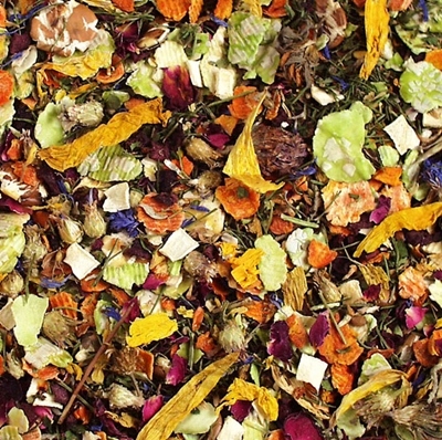Płatki grochu, płatki marchwi, płatki bobu, kwiaty chabra 5%, kwiaty słonecznika 5%, pasternak, pietruszka, burak, kwiaty koniczyny czerwonej, płatki róż
