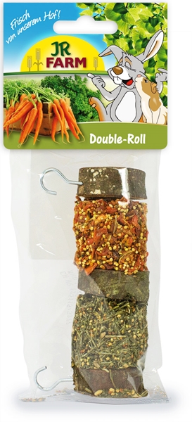 Rolka wykonana z drewna, wewnątrz znajduje się marchewka i pietruszka oraz nasiona prosa