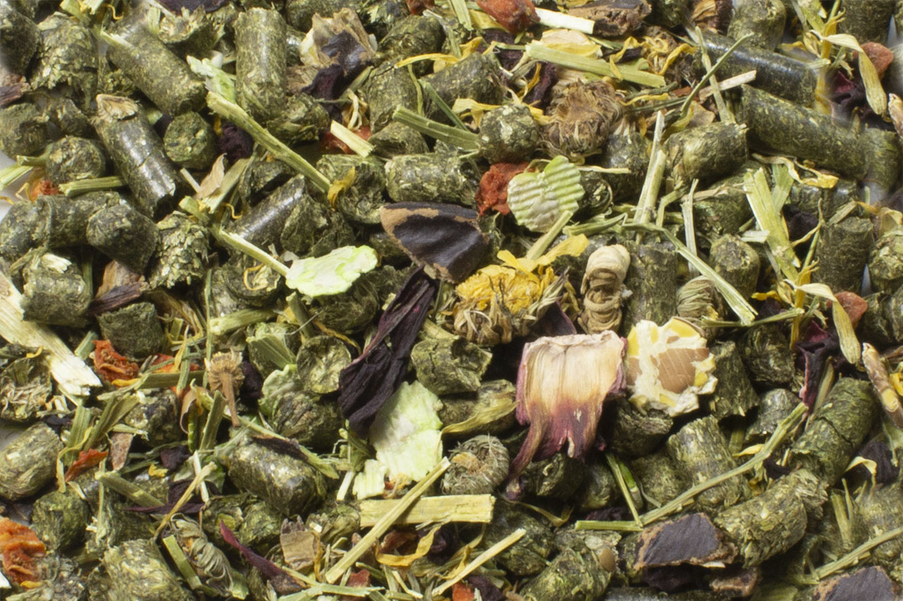Urozmaicona mieszanka z suszonych traw, lucerny, nasion i kwiatów została wzbogacona o smaczne zioła i warzywa.