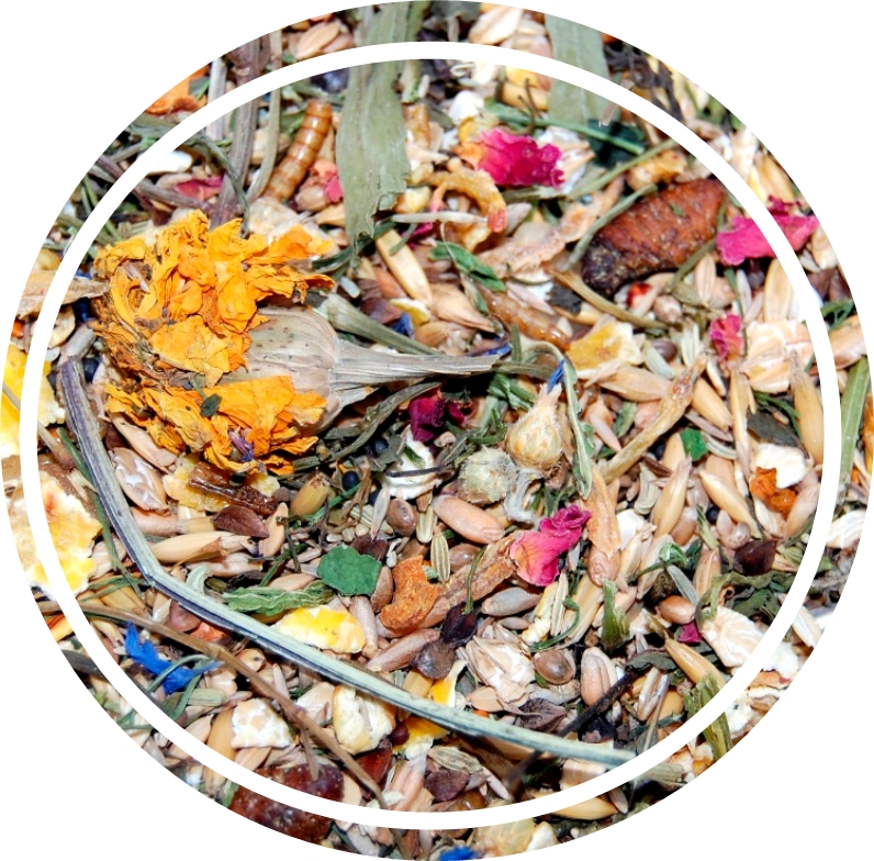Skład: Kasza gryczana, płatki kukurydziane, owies, nasiona kopru włoskiego, nasiona traw, jęczmień, orkisz, żyto, owies, płatki jęczmienne, nasiona konopi, nasiona maku, pszenica, ryż niełuskany, proso czerwone, proso zielone, proso senegalskie, sezam dmuchany, kminek, rzepak, Milo, Dari, łodygi kopru, suszone ryby słodkowodne, trybula, larwy jedwabnika, orzechy laskowe, kardi, nasiona nigru, chleb świętojański, dzika róża, chipsy bananowe, kostki ziemniaczane, kawałki marchewki, nagietek, mączniki, suszona mięta (0,7%), pietruszka (0,7%), płatki róży, szpinak, kwiaty rumianku, echinacea (jeżówka), nasiona słonecznika, pestki dyni, pasternak, płatki dyni, płatki pomidorów, babka, kwiaty bławatka