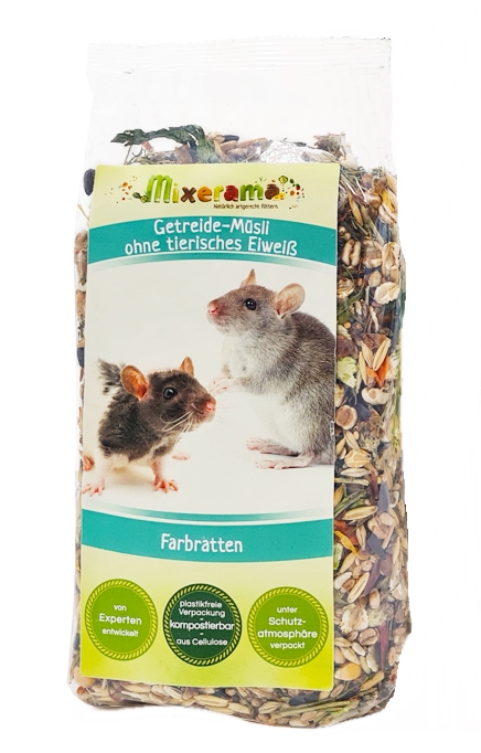 Wybierz Mixerama Farbratten Getreide-Müsli ohne tierisches Eiweiß 500g – pełnoporcjową mieszankę bez dodatku białka zwierzęcego.