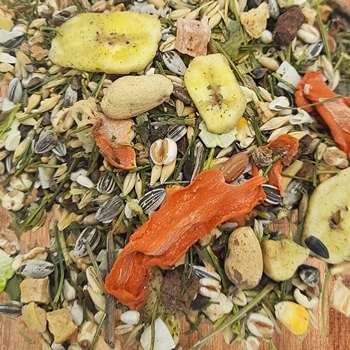 jabłko, jęczmień, nasiona słonecznika, owies, pszenica, pietruszka, kasza gryczana, kukurydza, płatki grochu, chleb świętojański łamany, proso, krokosz barwierski (kardi), plastry marchwi, chipsy bananowe, nasiona chwastów, poczwarki jedwabników, pszenica dmuchana, orzeszki ziemne w łupinach, chipsy kokosowe, ananas, mango, papaja, babka lancetowata, płatki owsiane.