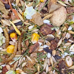 wytłoki jabłkowe, jęczmień, pszenica, owies, kukurydza, łodygi pietruszki, gryka, proso, płatki jęczmienne, płatki grochu, nasiona słonecznika, kawałki chleba świętojańskiego, krokosz barwierski (kardi), plasterki marchewki, prażona pszenica, nasiona chwastów, larwy mącznika, płatki owsiane, płatki bobu, orzeszki ziemne, kwiat nagietka, babka lancetowata, pestki dyni.