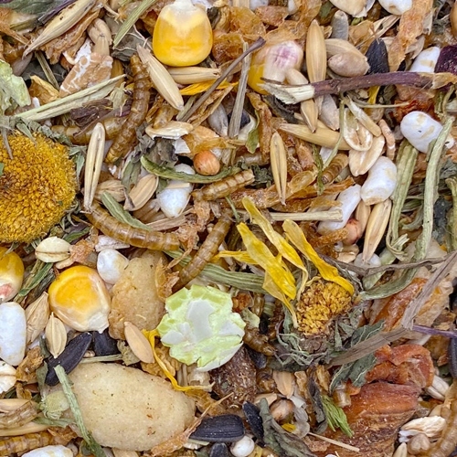 Pszenica, kukurydza, płatki owsiane, żyto, krewetki słodkowodne, owies, jęczmień, płatki grochu, nasiona słonecznika, ryż niełuskany, larwy mącznika, orzeszki ziemne, rodzynki, milo, ryż dmuchany, proso żółte, siemię lniane, liście mięty pieprzowej, sezam, plastry marchwi, łodygi szpinaku, dari, pestki dyni, burak czerwony, liście mniszka, kardi, murzynek (ziarno Nigru), chipsy bananowe, płatki orkiszowe, nasiona konopi, płatki pomidora, cukinia, kwiat rumianku, kwiat nagietka.