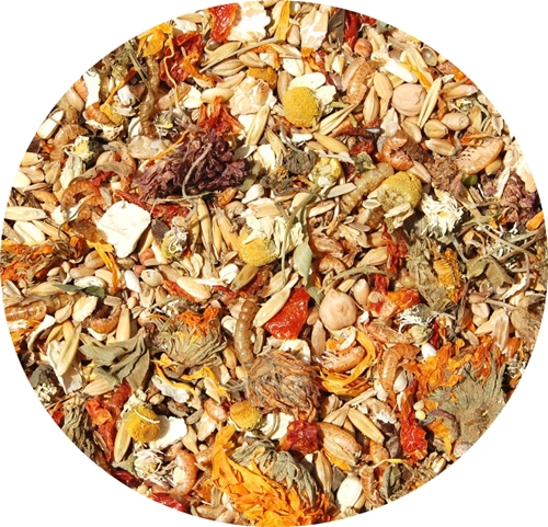 pszenica, owies, jęczmień, orkisz, proso, gryka, sorgo Milo, płatki owsiane, płatki jęczmienne, nasiona kanarka, ryż paddy, Kardi (krokosz), siemię lniane, nasiona konopi, nasiona kopru, nasiona czarnuszki, ostropest plamisty, fasola mung, ciecierzyca, papryka, suszony pomidor, kwiat nagietka, kwiat stokrotki, kwiat rumianku, korzeń pietruszki, koniczyna czerwona, gammarus, larwy mącznika.