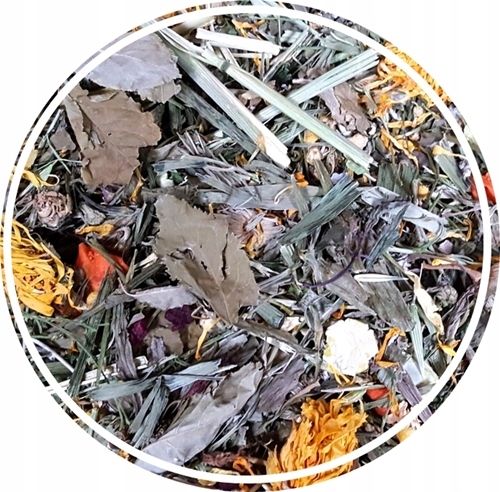 Skład: zielony owies, płatki grochu, płatki fasoli, natka pietruszki, kwiat nagietka, babka lancetowata, koper, płatki marchewki, burak czerwony, kwiat rumianku, liście mirabelki, maliny i mięty pieprzowej