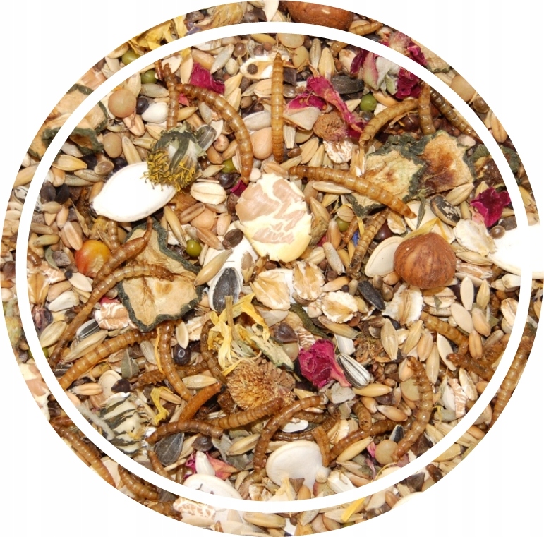 Skład: Orkisz, jęczmień, owies, żyto, gryka, mącznik młynarek, wyka, ciecierzyca, soczewica, fasola mung, nasiona konopii, ostropest, pachnotka zwyczajna, rzodkiew, nasiona rzepaku, płatki jęcznienne, płatki owsiane, kukurydza, ryż niełusany, płatki pszenicy, nasiona sałaty, nasiona ogórka, kardi, nasiona dyni, nasiona słonecznika, nasiona cukinii, groch żółty, groch zielony, dari, plastry ogórka, cukinia, chaber, kwiat mniszka lekarskiego, nagietek, płatki róży, kwiat koniczyny.