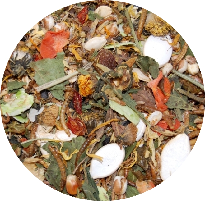Skład: nasiona traw, proso, płatki kukurydziane, owies, orkisz, plastry marchewki, plastry ogórka, larwy mącznika, płatki grochu, kukurydza, żyto, papryka zielona i czerwona, cukinia, liść i kwiat mniszka lekarskiego, kwiat nagietka, pszenica, płatki owsiane, pszenica dumuchana, gryka, pestki dyni, nasiona słonecznika, nasiona cukinii, krewetki słodkowodne, orzeszki ziemne, rodzynki