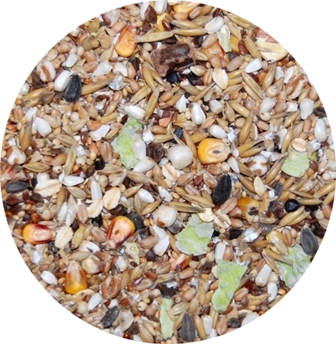 Skład: Proso, owies, jęczmień, cardi, siemię lniane, pszenica, gryka, nasiona chwastów, jęczmień, dari, kanar, pszenica dmuchana, płatki fasoli, kukurydza, płatki grochu, nasiona dzikiej róży, nasiona słonecznika, płatki owsiane, nasiona marchwi, chleb świętojański