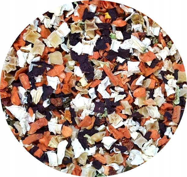 Skład: Kawałki marchwi, buraki, pasternak, płatki dyni, kostka cukinii, płatki pomidorowe, papryka czerwona i zielona.