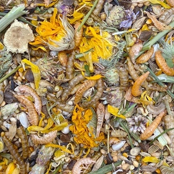 Mieszanka obejmuje również gammarus i krewetki słodkowodne oraz popularne larwy mącznika.