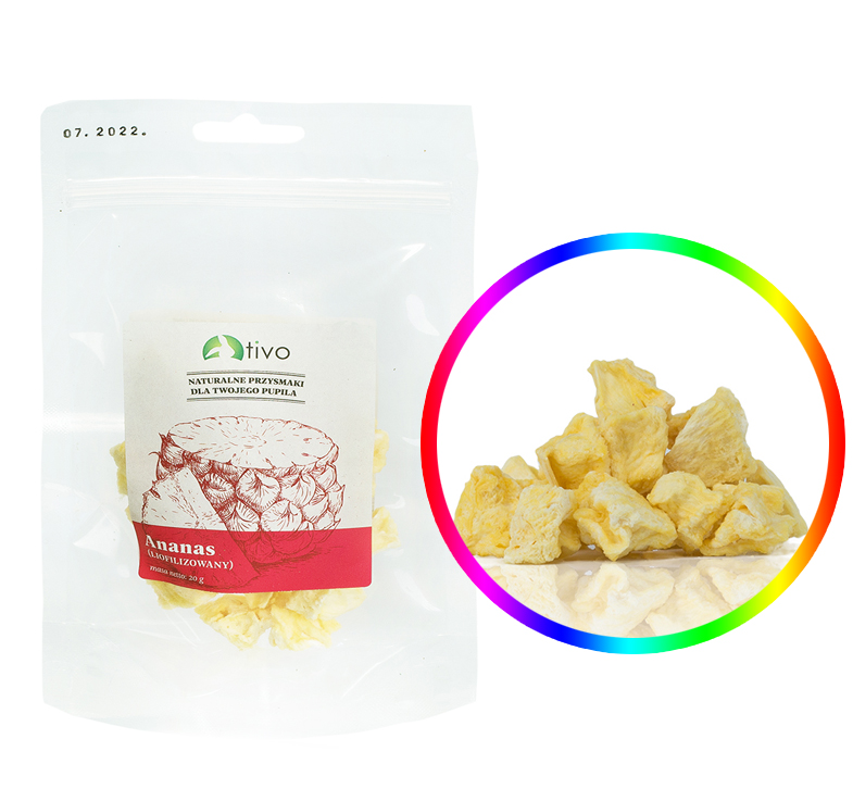 Ananas liofilizowany. Bez cukru, bez konserwantów, bez sztucznych barwników. Naturalny smak, aromat i kolor.