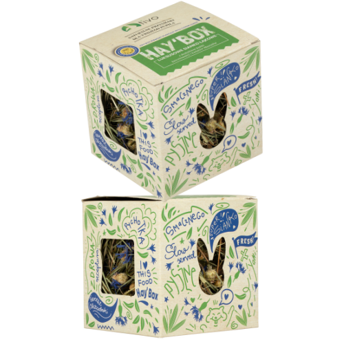 Kartonik, będący integralną częścią Hay'Box, został wykonany z roślinnej celulozy, co czyni go w pełni biodegradowalnym i przyjaznym środowisku. Nadruk na opakowaniu powstał przy użyciu wodnych farb i naturalnych, jadalnych barwników, dzięki czemu całość jest bezpieczna i nadaje się do spożycia przez zwierzęta.