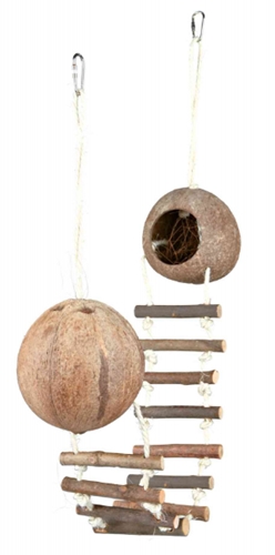 Domek na zewnątrz posiada drabinkę wykonaną z drewna oraz włókno kokosowe (idealna wyściółka dla gniazdka) wewnątrz.