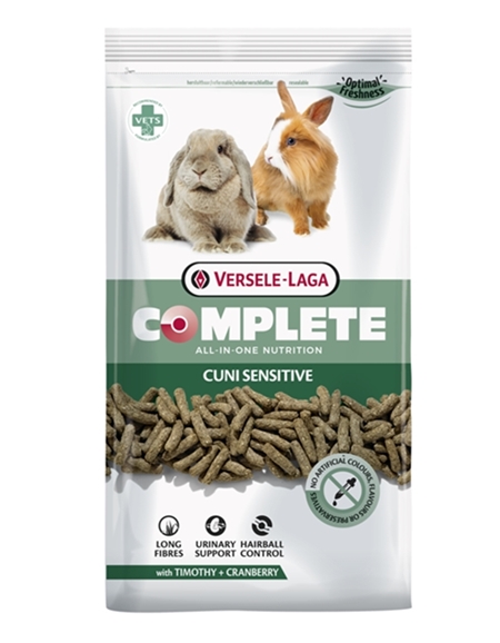 CUNI Sensitive Complete to wysoko zaawansowana technologicznie, ekstrudowana karma typu „all-in-one” dla królików miniaturowych o wrażliwym układzie pokarmowym. Receptura zawiera składniki odżywcze oraz nutraceutyki (naturalne substancje wspierające organizm), a forma granulatu zapobiega selektywnemu wybieraniu smaczniejszych elementów i związanym z tym niedoborom. Karma wyróżnia się bardzo wysoką smakowitością i jest często rekomendowana przez lekarzy weterynarii.