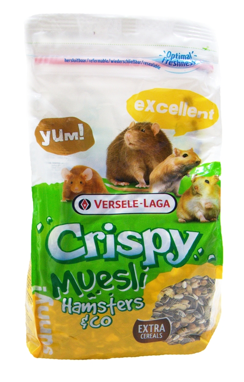 Smaczne, bogate w proteiny płatki Crispy Muesli dla chomików i innych wszystkożernych gryzoni to kompletna karma zawierająca dużą ilość zbóż i orzechów oraz ziarna.