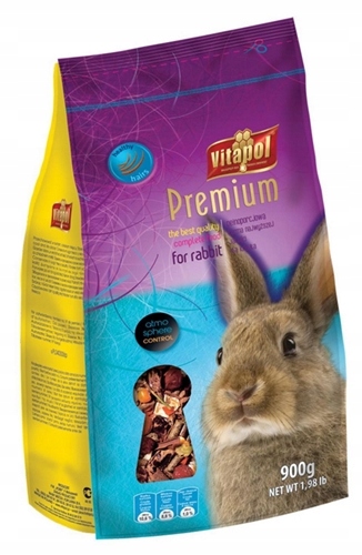 Pełnoporcjowa mieszanka dla królików, odpowiednio zbilansowana, w której ilość zbóż została zmniejszona na rzecz różnego rodzaju granulatów i witaminizowanych ekstrudatów.