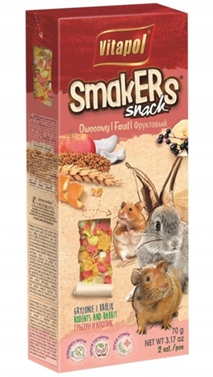 Dzięki odpowiedniej twardości oprócz wartości odżywczych Smakersy Vitapol dbają również o regularne ścieranie siekaczy u gryzoni i królików