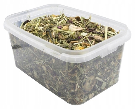 roślinne produkty uboczne (tymotka (16%), lucerna 12%, kora wierzby 2%, kwiat nagietka 2%, kwiat róży 1%, warzywa, nasiona (siemię lniane).