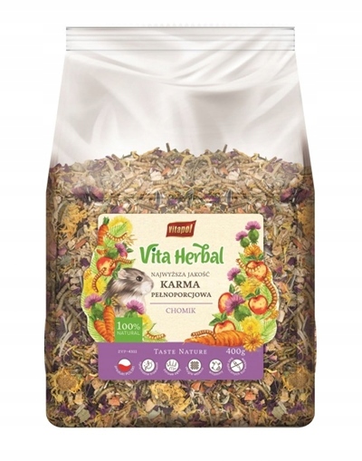 Vita Herbal karma dla chomika to w 100% naturalna karma dla chomików, której rozbudowany skład zawiera zarówno zboża, ziarna, owoce, warzywa, zioła jak i dodatek suszonych larw mącznika oraz krewetki.